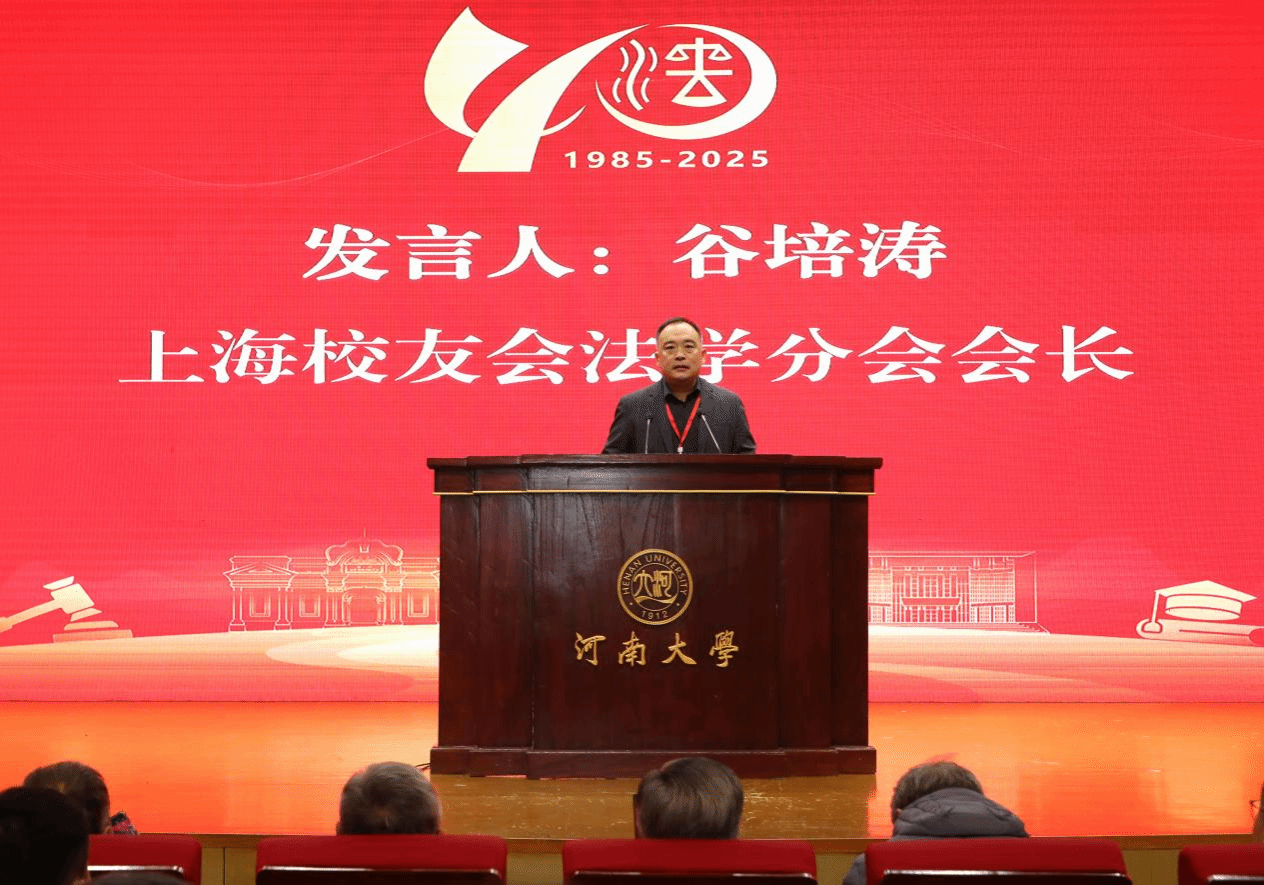 上海校友会法学分会会长谷培涛感恩母校培育,代表校友承诺将传承优良学风、助力学科与学校建设。