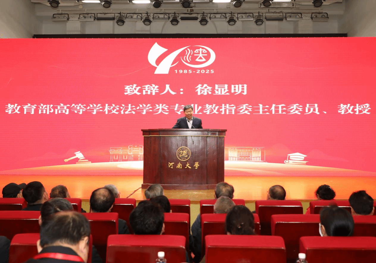 教育部高等学校法学类专业教学指导委员会主任委员徐显明在致辞中对河南大学法学学科恢复重建四十周年表示祝贺,阐释一流大学法学院的标准,指出法学学科建设的四项要素、法学教育的五大功能,并对河南大学法学学科未来发展提出殷切期望。
