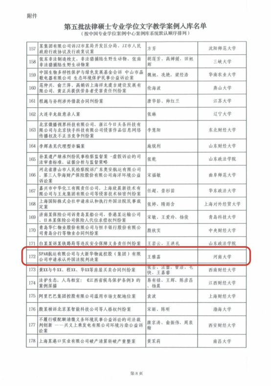 为推进法律硕士专业学位教学案例开发和案例教学工作,全国法律专业学位研究生教育指导委员会于2025年2月27日启动本年度案例征集工作,得到全国152个培养单位的积极响应。经专家严格评审、教指委会议审议及教育部学位与研究生教育发展中心审查,最终241个优秀案例收录至“中国专业学位案例中心案例库”。我院王雅菡老师编写的《SPAR航运有限公司与大新华物流控股(集团)有限公司申请承认外国法院判决案》,凭借鲜明的实践导向与深厚的理论价值成功入库。该案例聚焦国际司法协助领域实践难点,贴合涉外法律实务热点,精准契合法律硕士研究生实践教学需求。
