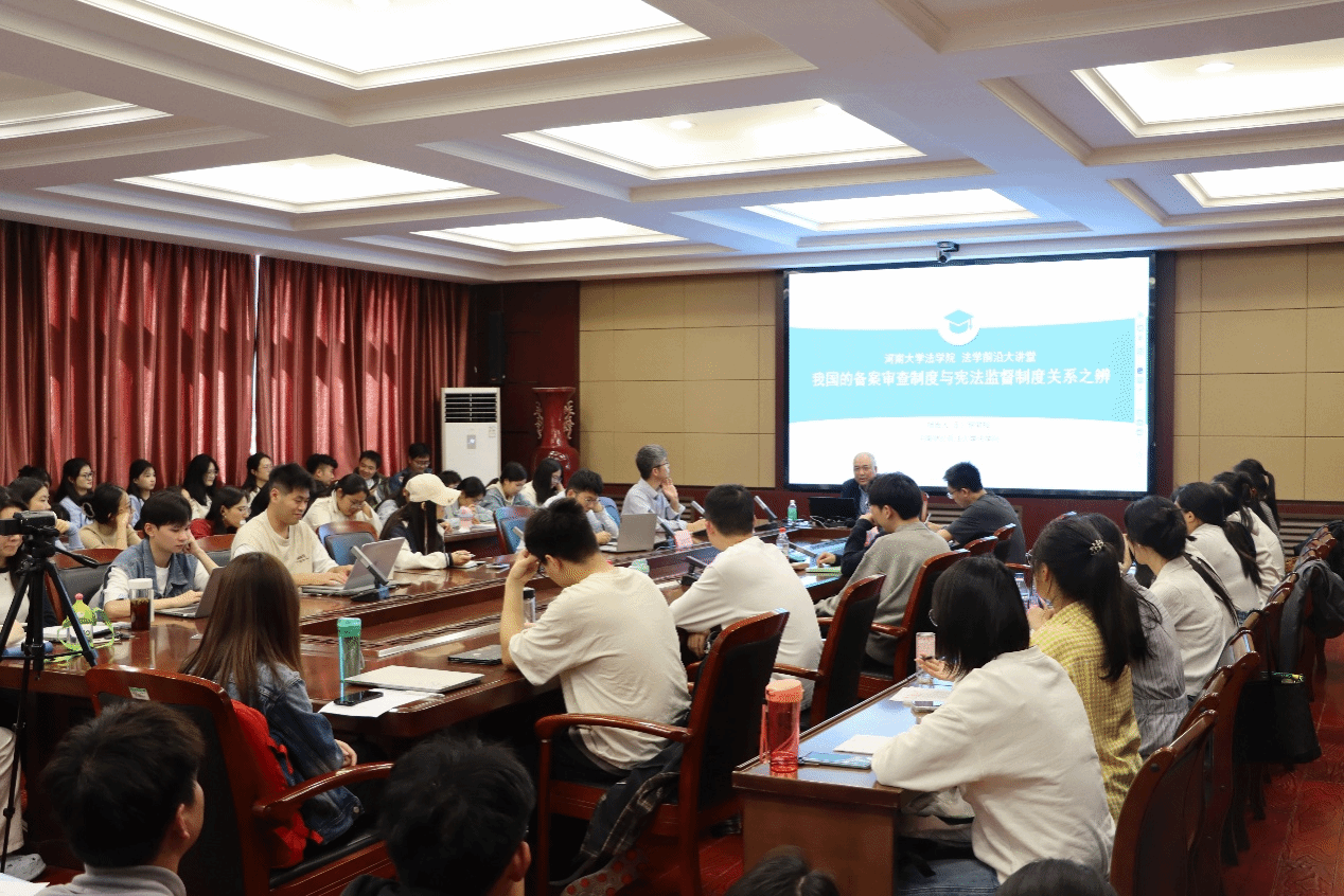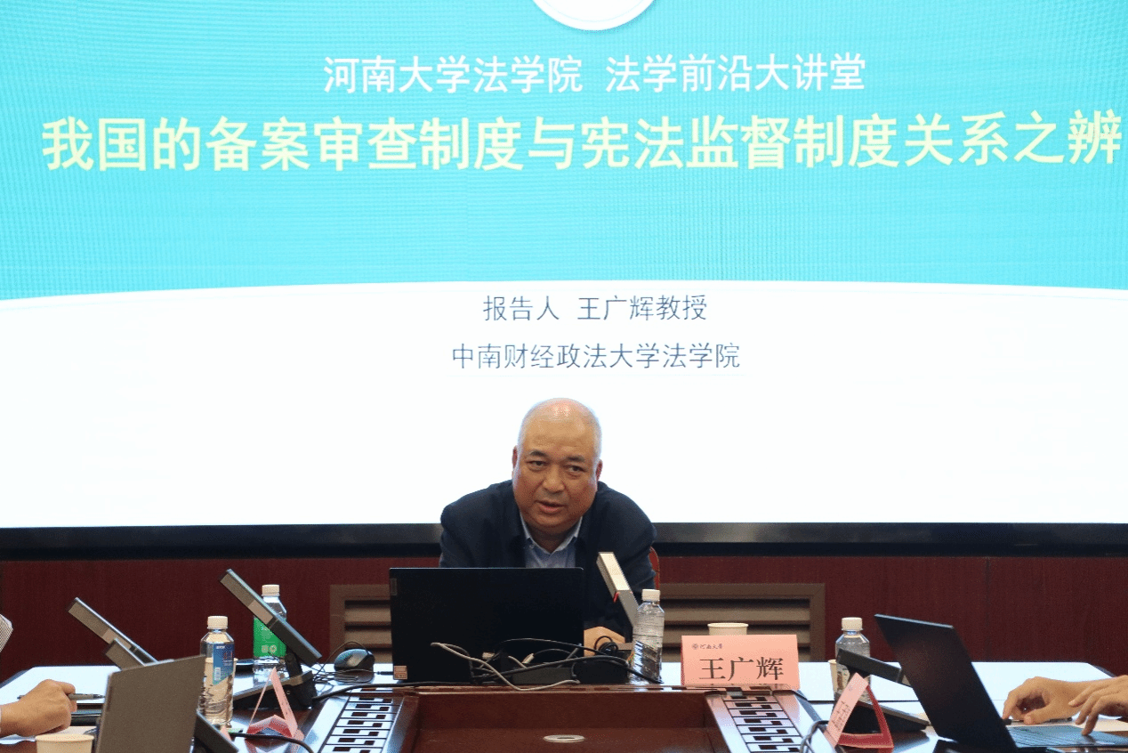 9月24日下午,中南财经政法大学法学院教授、博士生导师王广辉受邀做客河南大学法学院,在第一会议室为我院师生作题为“我国的备案审查制度与宪法监督制度关系之辩”的学术讲座。本期讲座由副院长王利担任主持人,王孟嘉副教授、聂帅钧老师担任与谈人,法学院师生积极参与讲座,现场学术氛围浓厚。