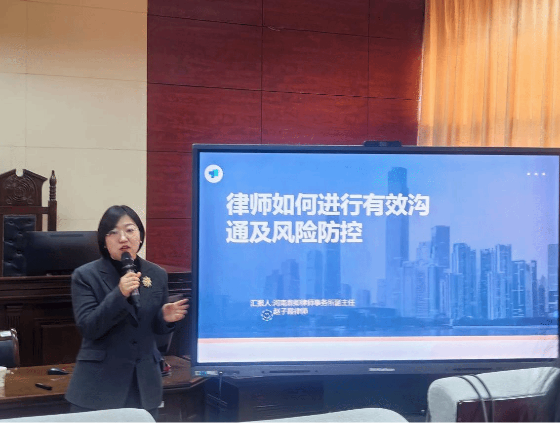 11月15日下午,河南鼎卿律师事务所赵子霞副主任受邀做客我院法律硕士实务讲堂,以“律师如何进行有效沟通及风险防控”为主题进行了一场兼具理论深度和实务指导性的讲座。本次授课由法学院副院长王利主持,近百名法律硕士学生参与学习,现场学习氛围浓厚。