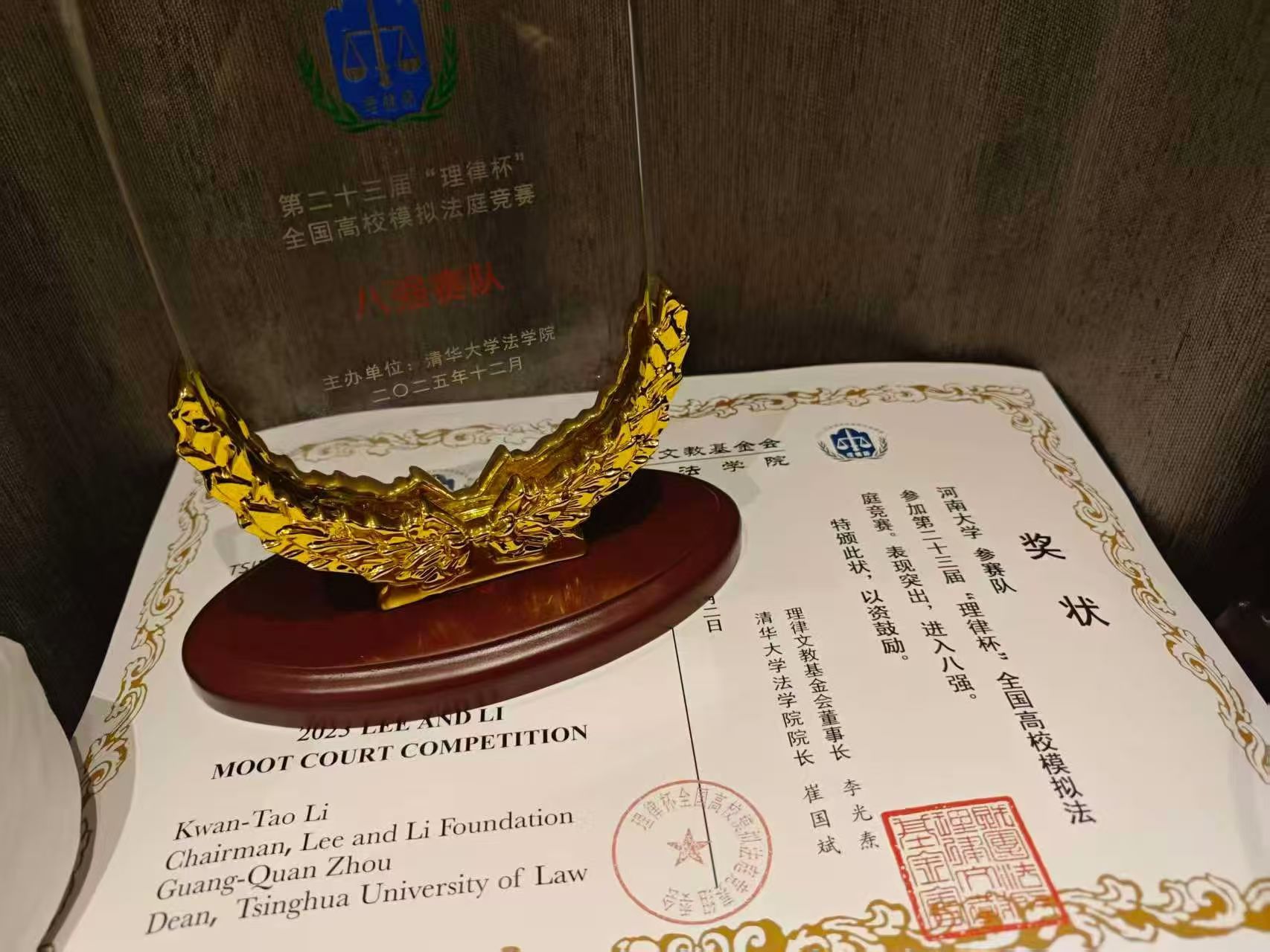 近日,由清华大学法学院主办、台湾理律文教基金会协办的第二十三届“理律杯”全国高校模拟法庭竞赛圆满落幕。本届赛事吸引了来自全国40所高校的优秀代表队同场竞技,围绕“上市公司信息披露义务与投资者利益保护的法律争议”这一前沿实务热点,展开深度研讨与精彩交锋。我院代表队在贾永健、马可欣两位老师的指导下,凭借扎实的专业素养、出色的临场发挥,一路过关斩将,最终成功跻身全国八强,贾浩洋同学荣获“最佳辩手”,展现了我院学子卓越的法律实务能力与团队风采。