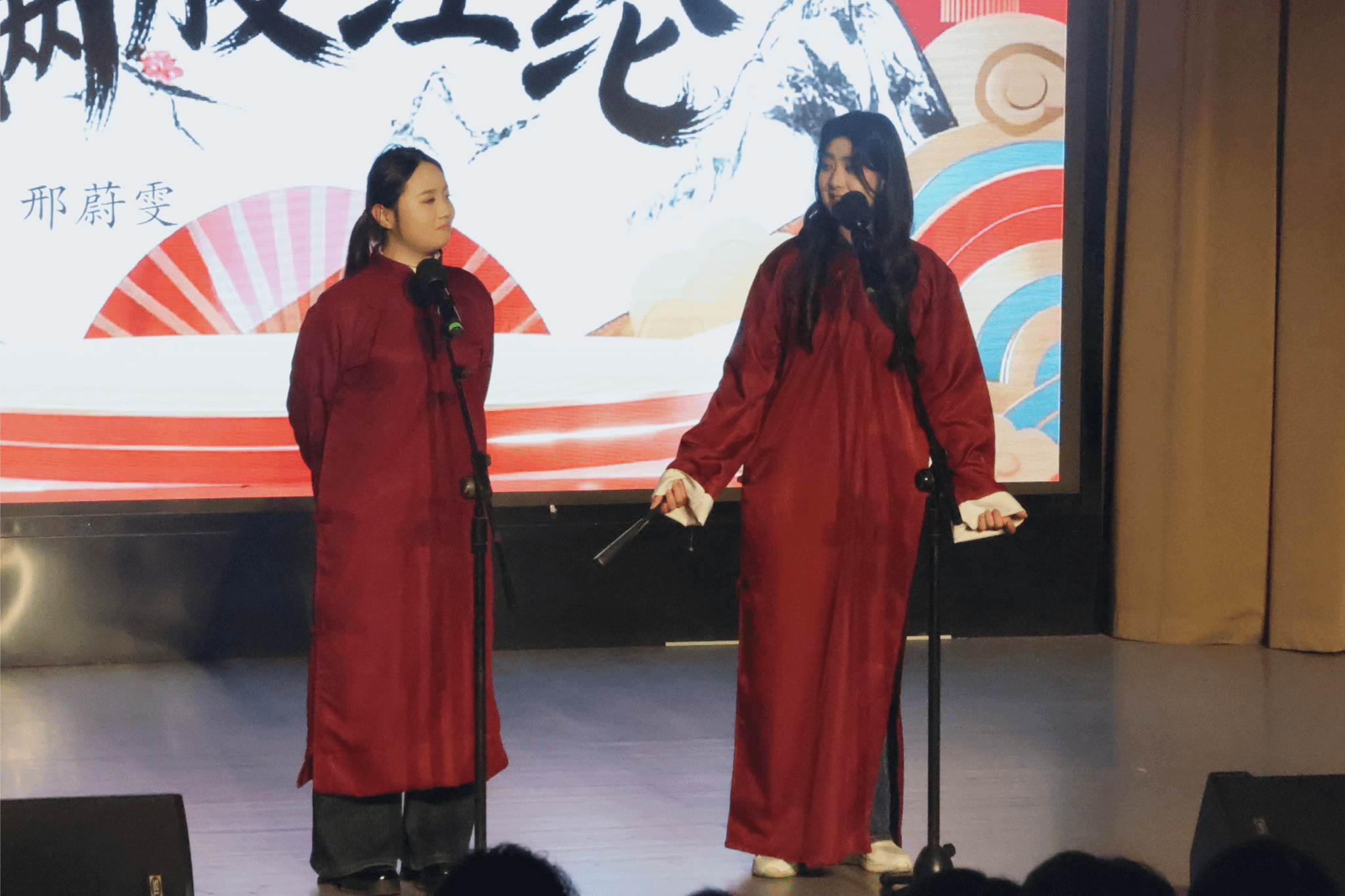 典礼结束后,国基律师事务所胡大宽律师登台,将现场气氛推向高潮。一曲《这不是遥远的地方》与《在那桃花盛开的地方》接连唱响,歌声浑厚,情深意长,以动人旋律传递深沉情怀;歌舞《爱你》甜蜜展开,演绎地轻盈动人,洋溢着青春的欢悦;朗诵《法学长河,再启新篇》深情献声,字句铿锵,展现法学底蕴与崭新憧憬;歌曲串烧联袂呈现,旋律流转间唤起阵阵共鸣;小品《再见老李》阵容盛大,同学们以诙谐真挚的演出,勾勒温情笑泪。